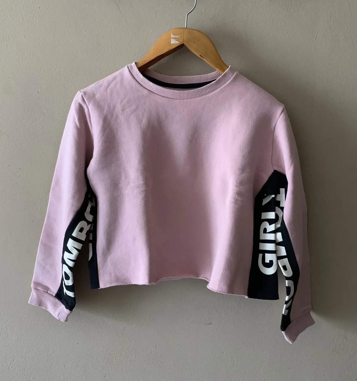 Buzo de corte crop (corto al ombligo) y cuello redondo. Confeccionado en algodón con friza, súper cómodo y abrigado. Diseño moderno en color rosa y paneles laterales en negro con tipografía blanca a contraste en las mangas. La etiqueta marca Talle 2/42, pero por la moldería corresponde a un S. (Medidas de etiqueta: busto 88/90cm, cintura 66/70cm, cadera 80/84cm, altura 1.66/1.70cm). Estado muy bueno. Conserva su estructura, pero presenta una micro pintita azul en el frente casi imperceptible (ver última foto al detalle).