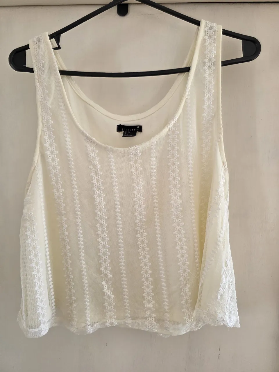 Musculosa de encaje color blanco roto. Posee un diseño de tiras verticales con pequeños detalles florales.