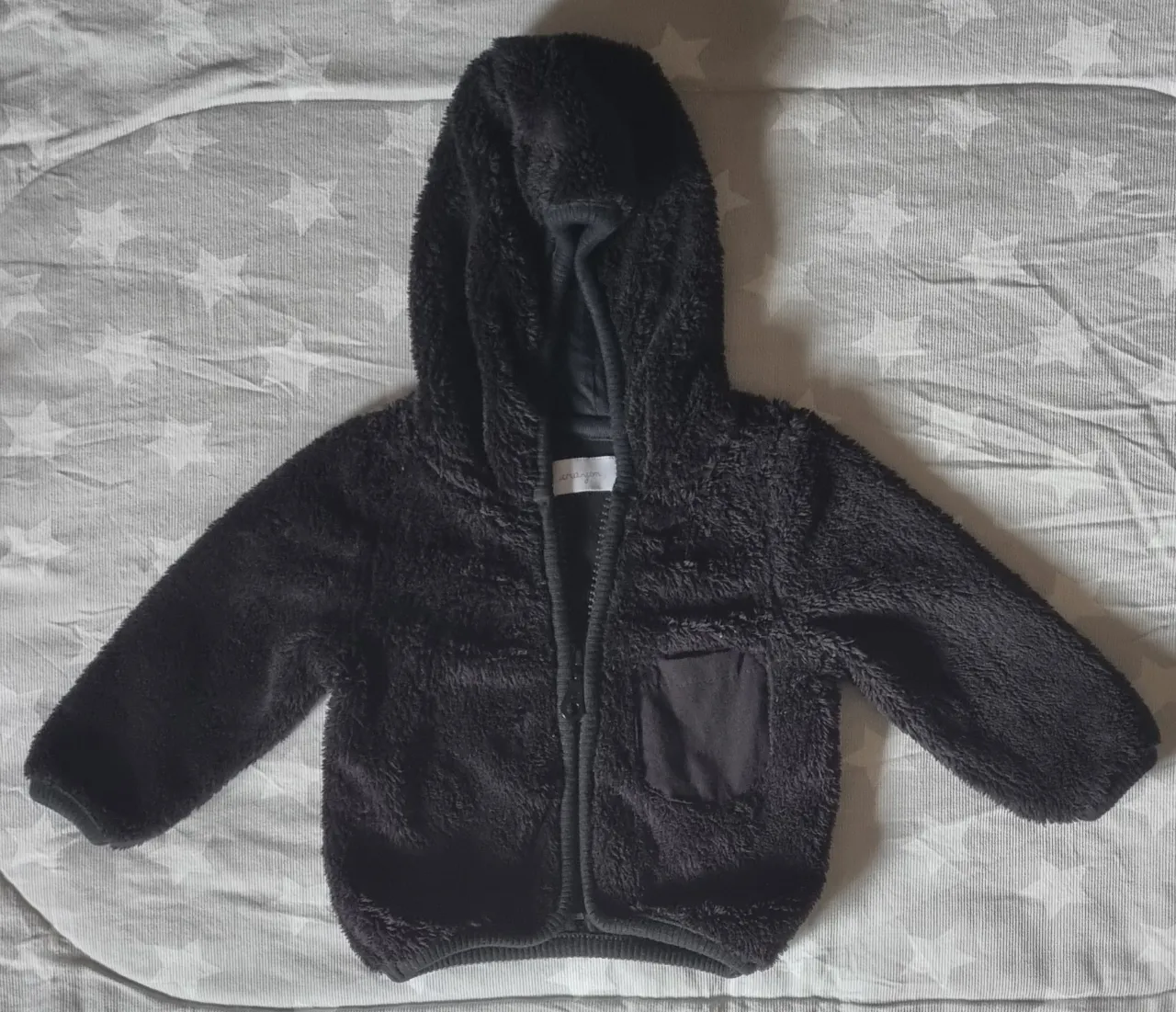 Abrigo de micropolar negro con capucha, ideal para mantener a los más pequeños abrigados en días fríos. Posee cierre al frente y un bolsillo aplicado en el frente.