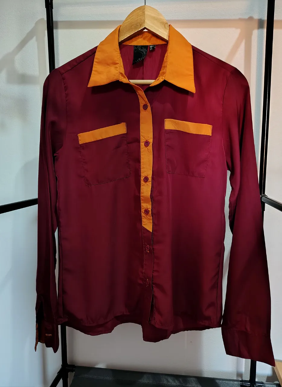 Camisa de manga larga color bordó con detalles y cuello en color naranja. Posee dos bolsillos delanteros con solapa y botones al frente.