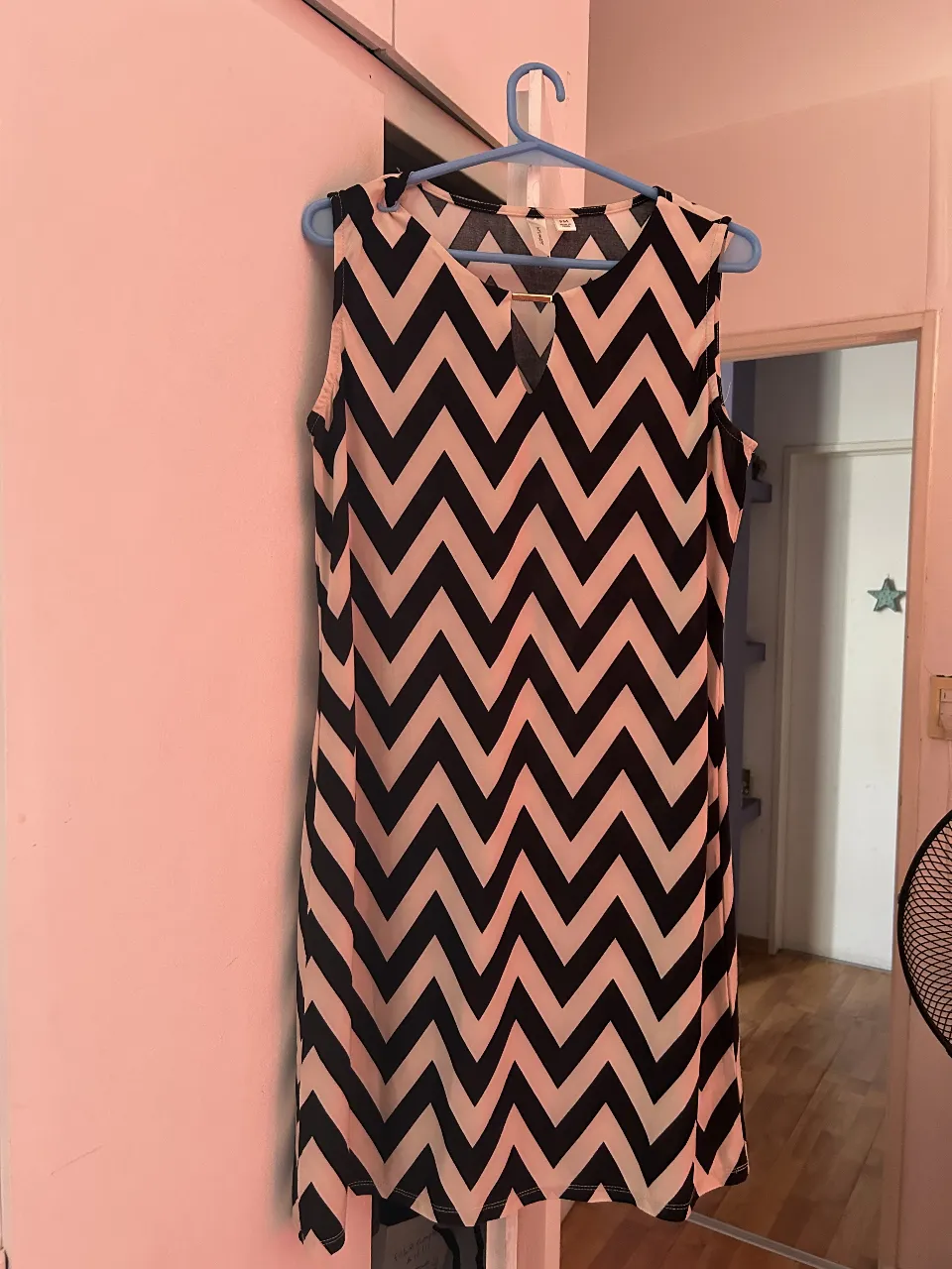 Vestido corto con estampado de zig-zag en blanco y negro. Diseño sin mangas y con un detalle cut-out en el escote.