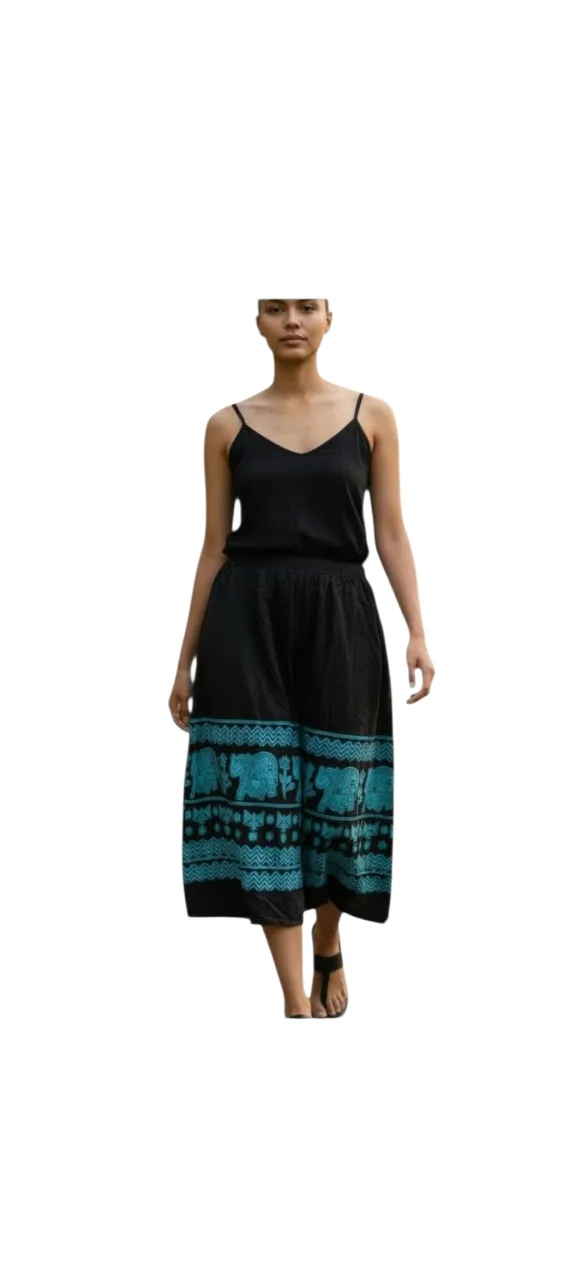 Pollera amplia negra,con cintura elástica y tajo traseros a la altura de media pierna. Estampa de elefantes en color turquesa. Ideal para un look relajado y con estilo. Cintura: 32cm. Largo: 77cm