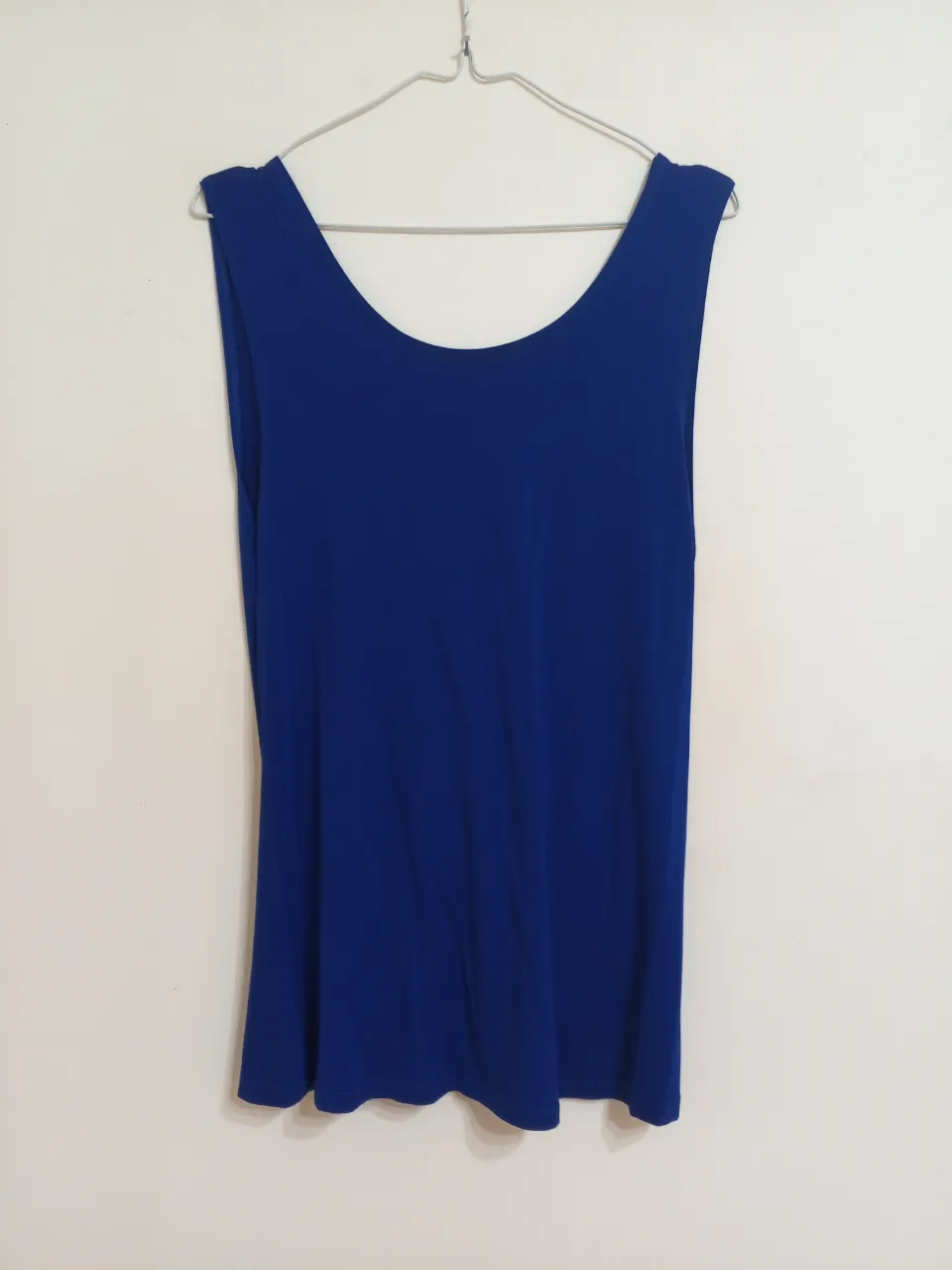 Musculosa azul con escote redondo delantero y detalle de torsión en la espalda descubierta.