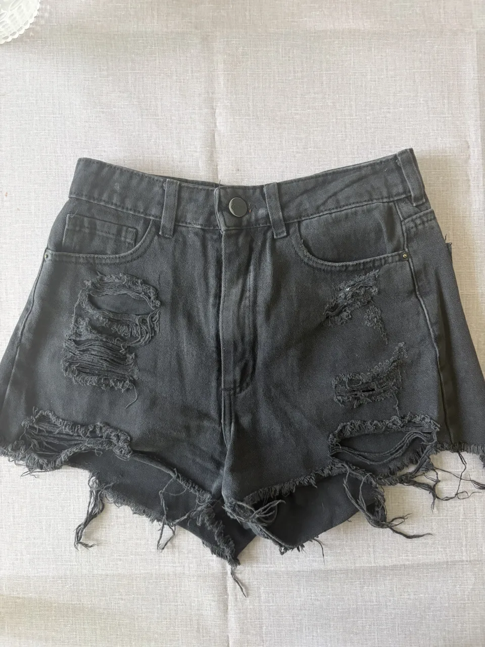 Shorts de jean negros con roturas y detalles deshilachados. Tiro alto, ideales para un look canchero y moderno.