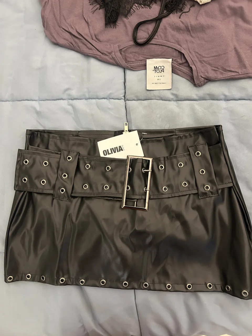 Pollera negra corta con detalles de tachas y hebilla metálica en la cintura. Tiene cierre. Es regulable.