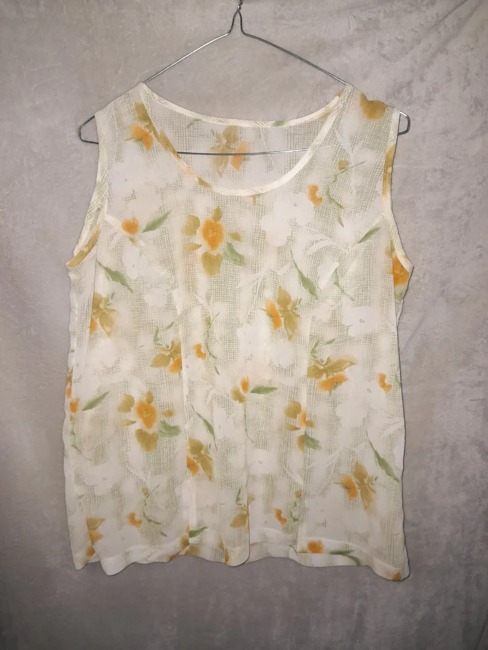 Musculosa blanca con estampa floral en tonos amarillos y verdes. Posee cuello redondo.
