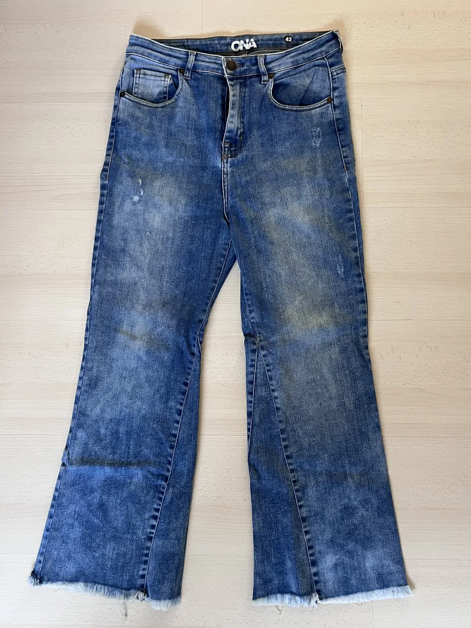 Jeans tiro alto estilo "flare" con roturas y detalles desgastados. El corte es ajustado en la cadera y se ensancha desde la rodilla hasta el ruedo, que tiene un acabado desflecado. Ideales para un look canchero y moderno.