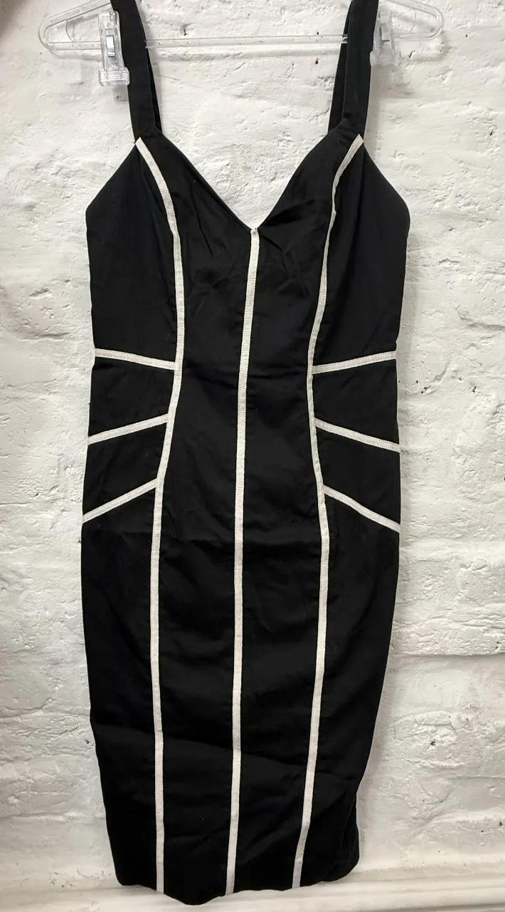 Vestido Las Oreiro negro ajustado con detalles de costuras blancas. Diseño con escote en V y tirantes finos. Ideal para una salida o fiesta.