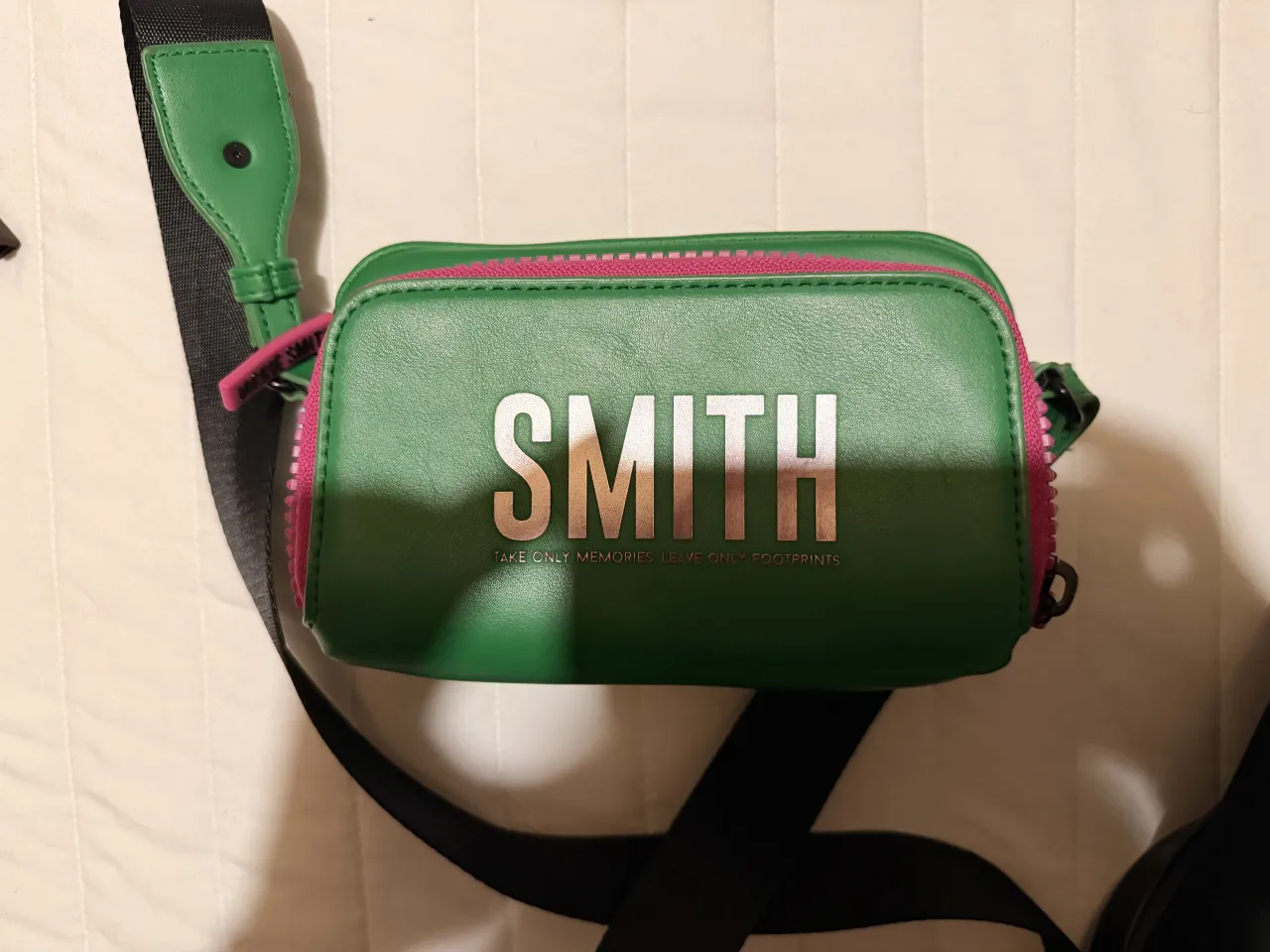 Cartera de Pu JACKIE SMITH verde con detalles en fucsia. Tiene un bolsillo principal con cierre y otro bolsillo frontal también con cierre. En el frente tiene la palabra "SMITH" en letras plateadas y una frase debajo. Incluye una correa larga ajustable.