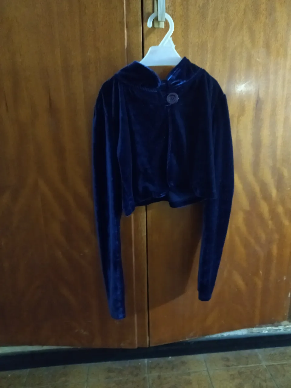 Bolero de terciopelo azul con cuello alto y un botón en la parte delantera.