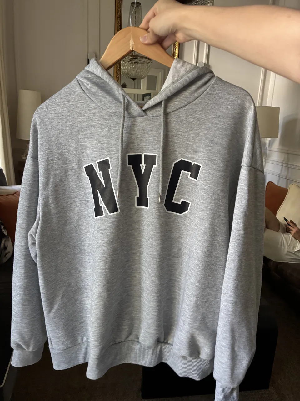 Buzo gris con capucha y cordones. Estampado frontal con las letras "NYC" en negro con borde blanco.