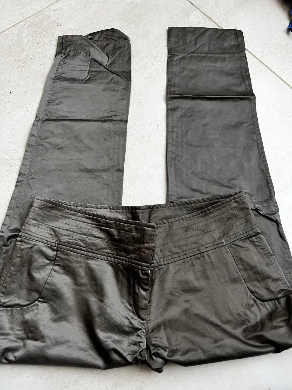 Pantalón largo de tela color gris oscuro. Posee bolsillos delanteros y cierre con botón.
