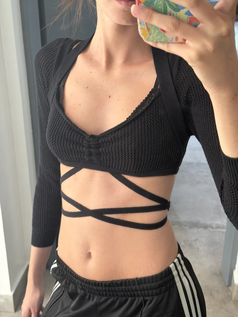 Top negro de tejido con mangas largas y escote pronunciado. Posee tiras que se cruzan en la cintura y se atan en la espalda. El escote tiene un detalle fruncido.