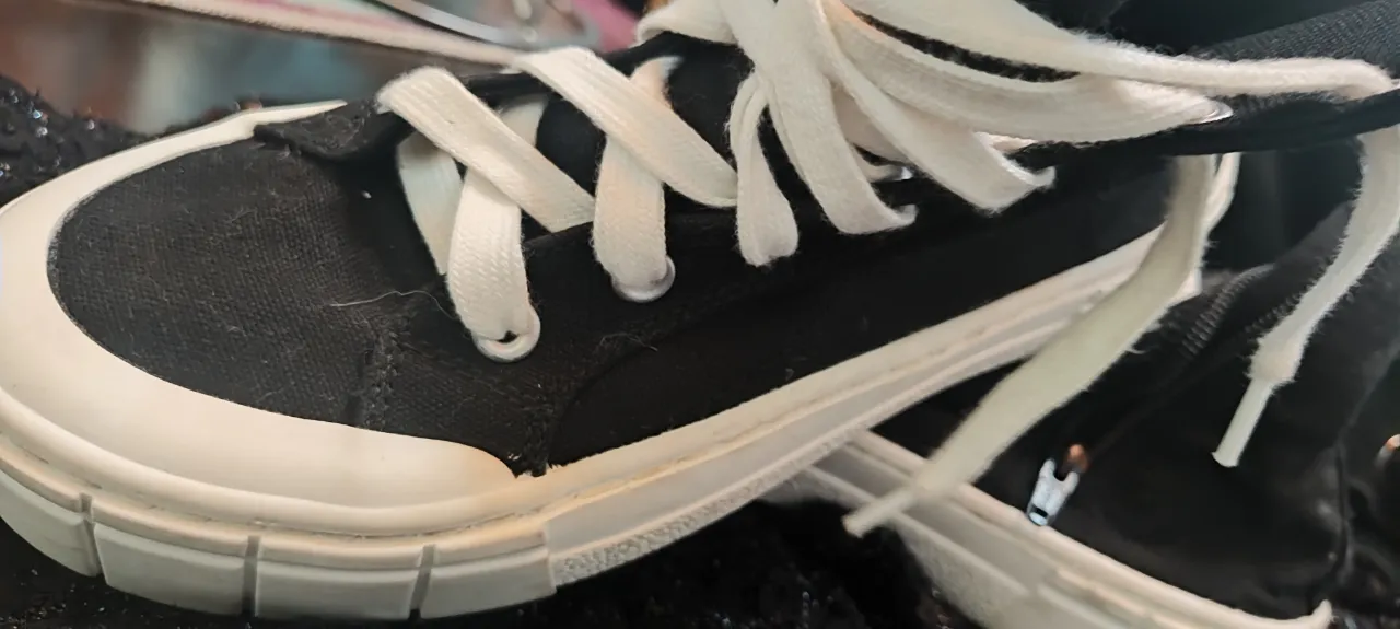 Zapatillas urbanas de lona negras con cordones blancos y cierre lateral. Suela blanca de plataforma con detalles de diseño.