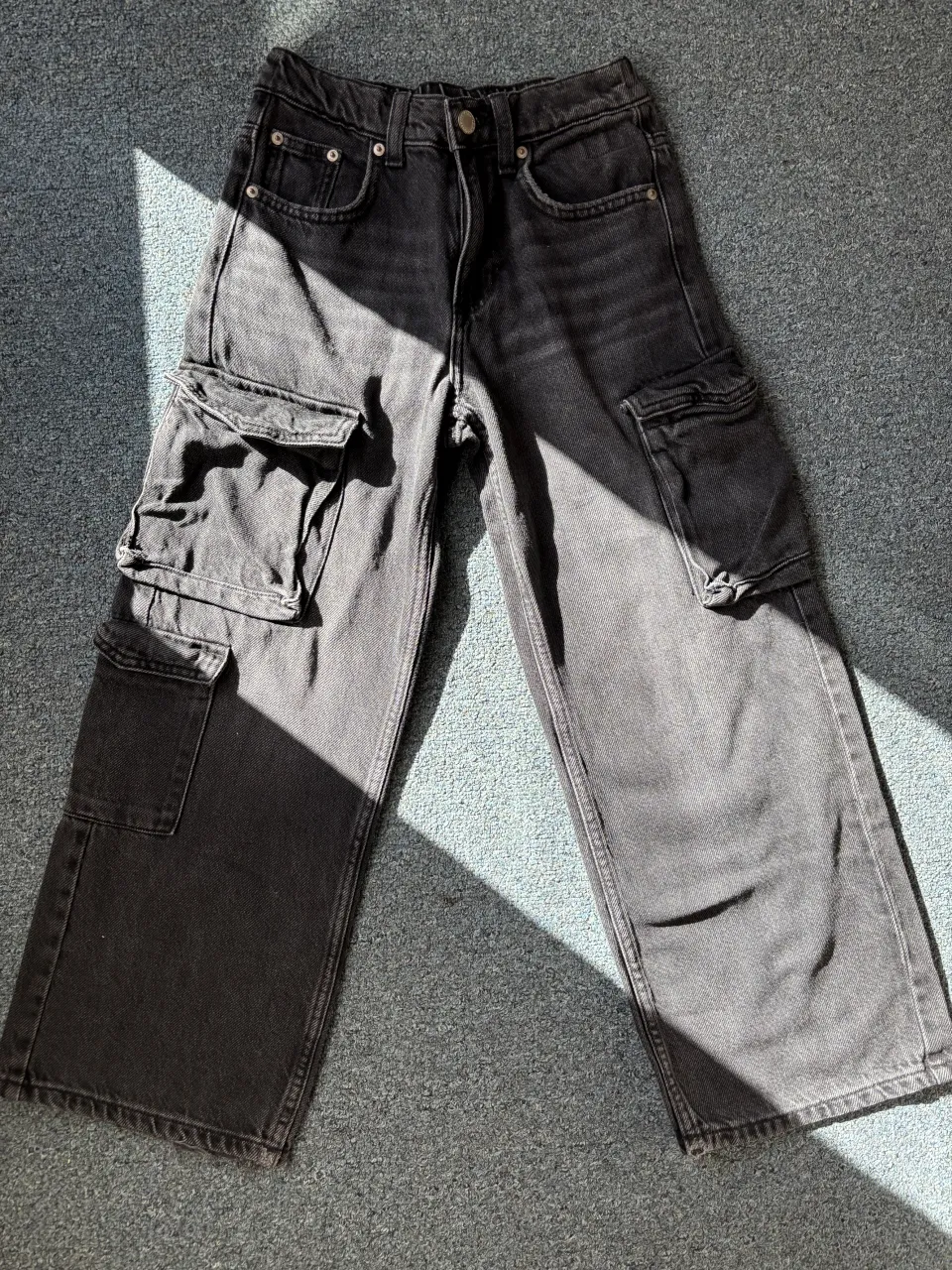 Pantalón cargo de jean gris oscuro. Posee bolsillos cargo en los laterales de las piernas y bolsillos traseros. Cintura con elástico y botón.