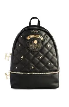 Mochila negra de cuero sintético con diseño acolchado y detalles de Harry Potter. Tiene un parche de Hogwarts en el frente, apliques de estrellas y rayos, y dijes de la letra 'H' en los cierres. Ideal para fans de la saga. marca primark