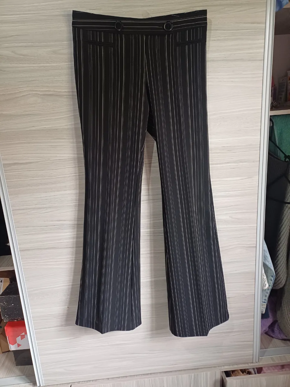 Pantalón de vestir negro con finas rayas verticales blancas. Cierre con dos botones en la cintura. medidas en superficie plana (no cede): cintura: 38 cm cadera: 46 cm largo: 1.01cm tiro: 23cm