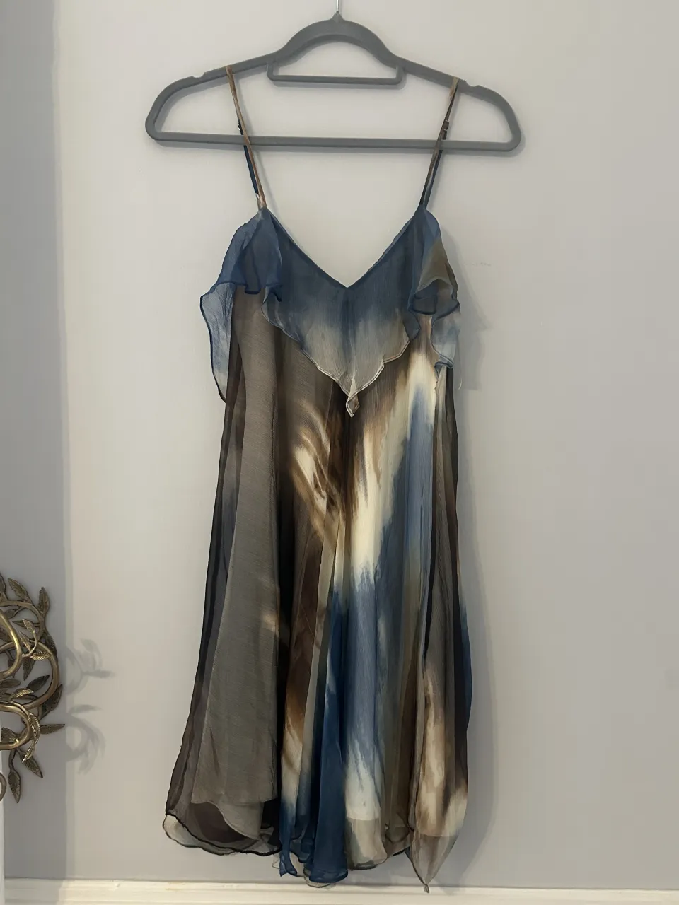 Vestido UMA corto con tiras finas regulables y detalles de volados en el escote. Estampado abstracto en tonos azules, marrones y crudo. Hermoso vestido!