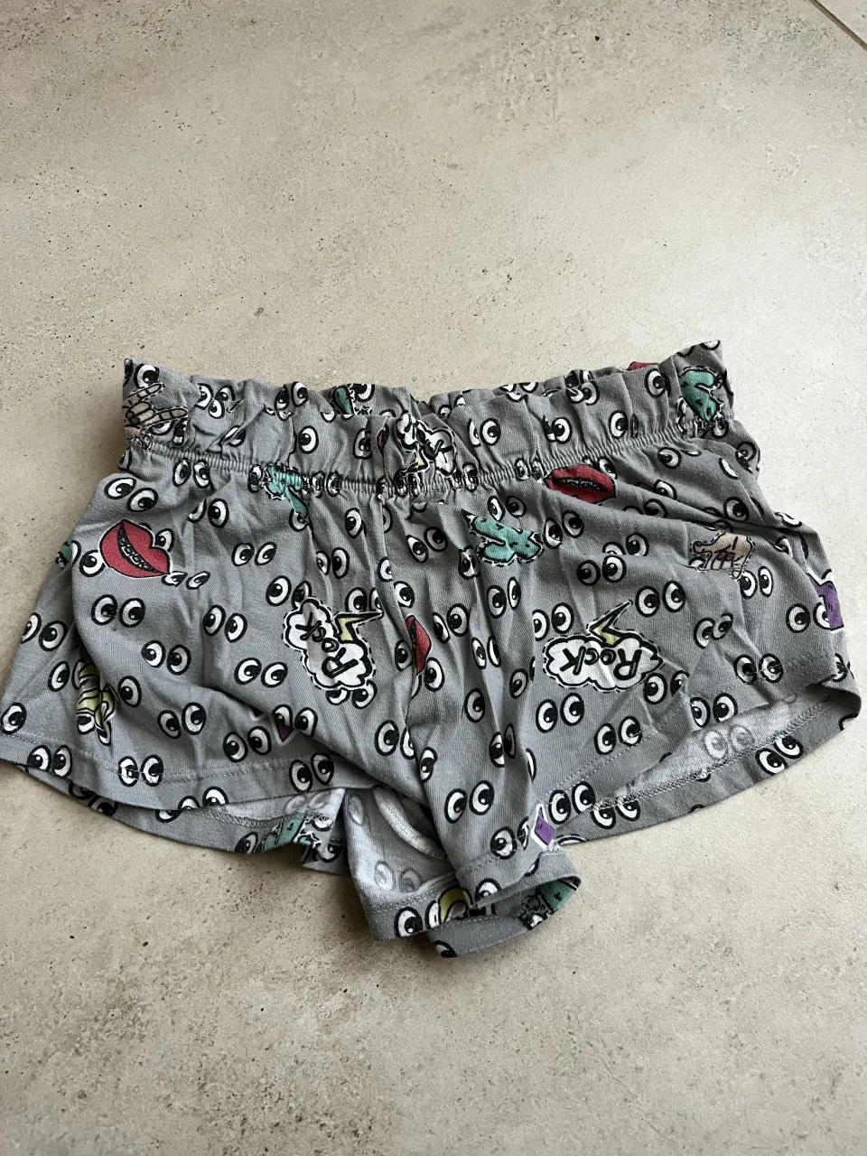 Shorts grises con estampa de ojos, labios y nubes con la palabra "Rock". Cintura elastizada.
