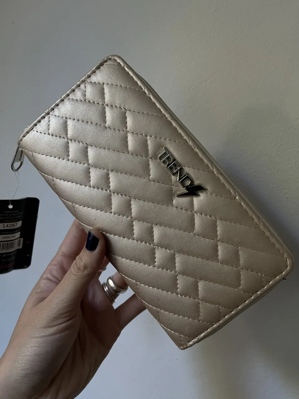 Billetera dorada acolchada con cierre y logo de la marca. Interior con múltiples compartimentos y cierre.