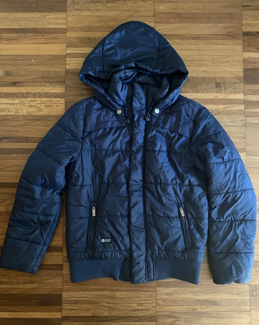 Campera azul marino acolchada con capucha, super abrigada. Posee cierre al frente, bolsillos con cierre a los costados y puños y cintura elastizados. La tela tiene algunos detalles en la espalda, en la ultima foto se ven.