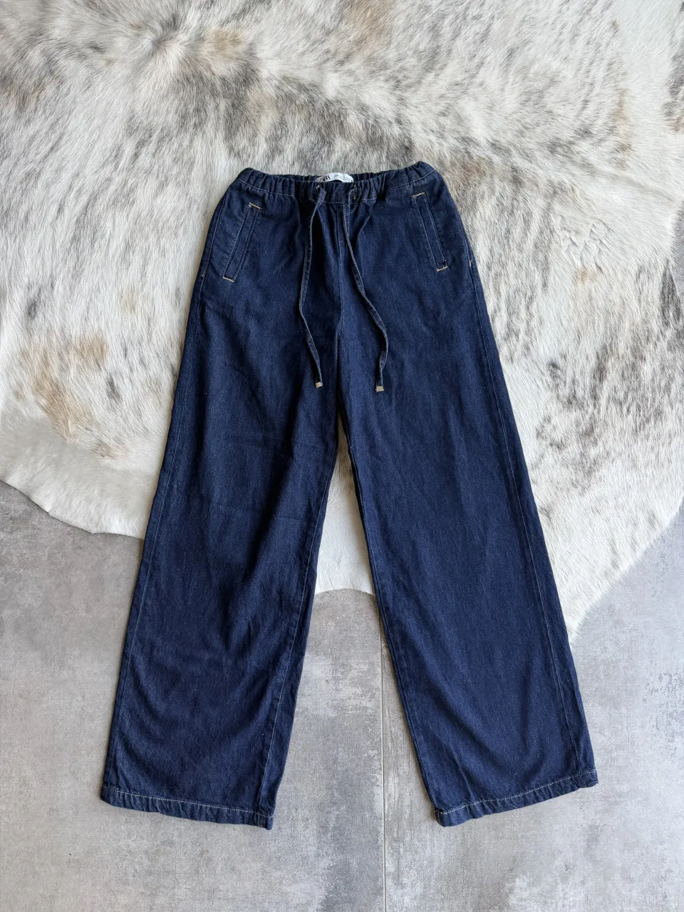 Pantalón de jean azul oscuro con cordón ajustable en la cintura y bolsillos delanteros y traseros.