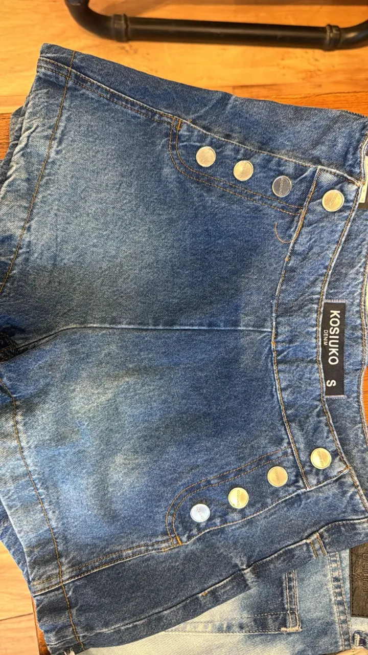 Shorts de jean azul con botones dorados en la parte delantera. Posee un bolsillo superior con detalle de botones.
