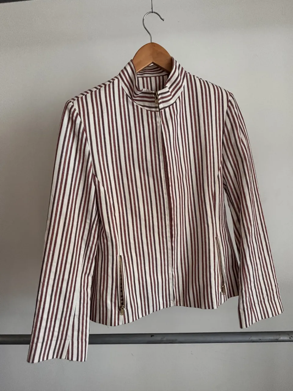 Blazer a rayas verticales en blanco y bordo, con cuello mao y cierre metálico. Posee bolsillos con cierre en los laterales.