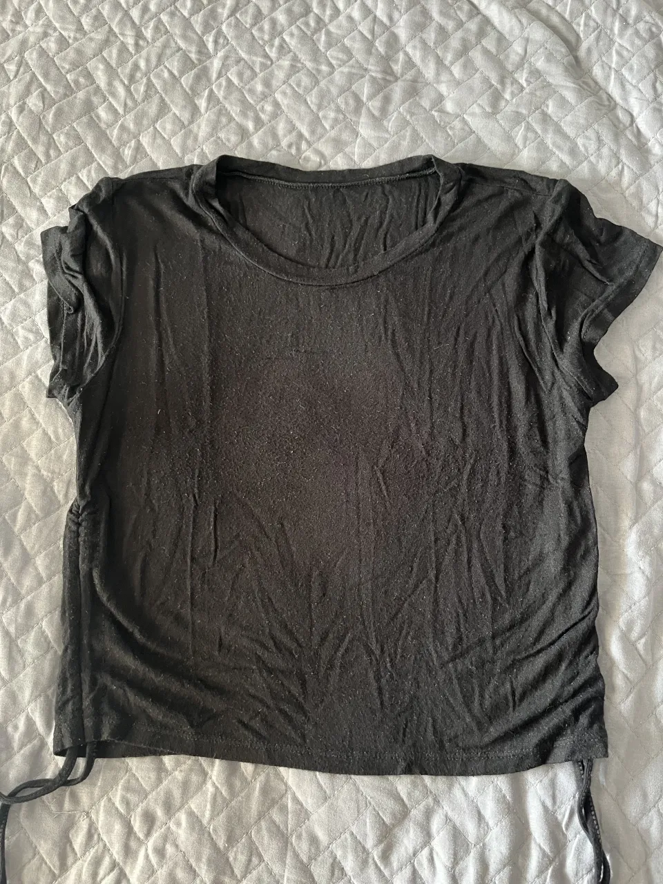 Remera negra de manga corta con cuello redondo. Posee fruncido lateral con cordones ajustables. (Podés usarla corta o larga)