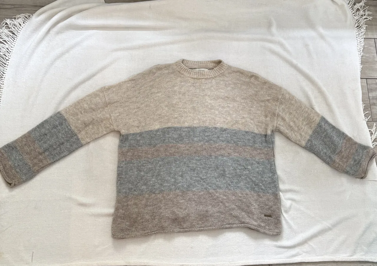 Sweater de tejido de punto con franjas horizontales en tonos beige, gris y marrón. Cuello redondo y mangas largas.