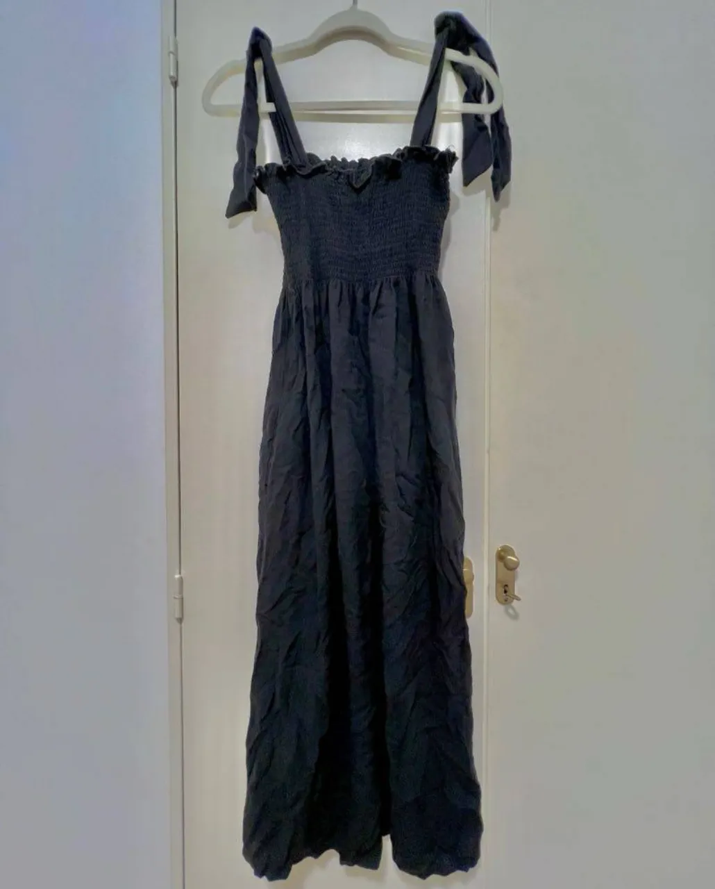 Vestido largo negro con tiras anudadas en los hombros y detalle fruncido en el busto. Ideal para un look fresco y canchero.