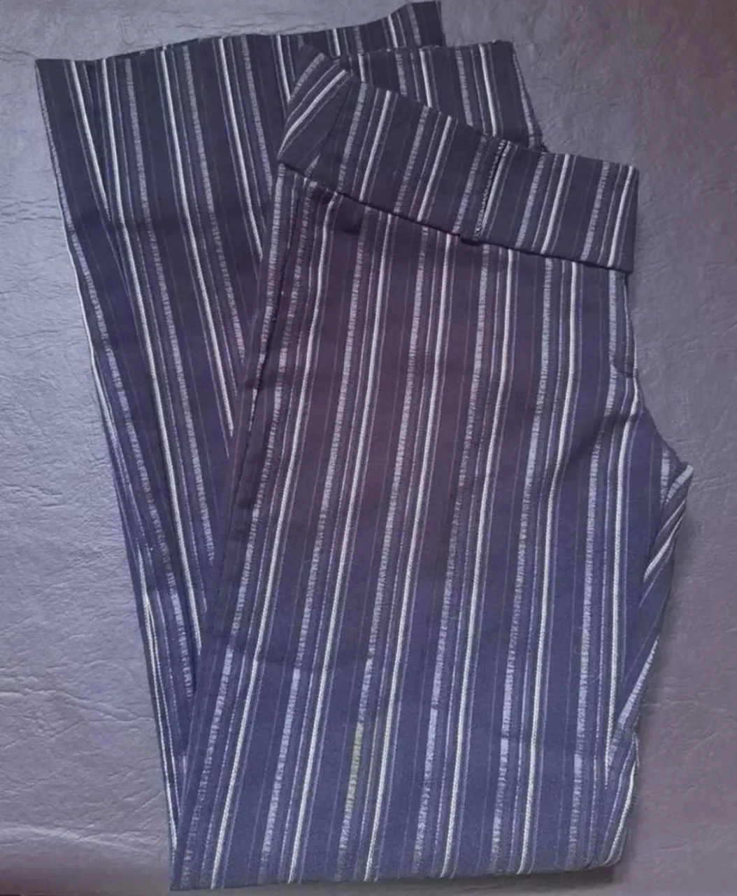 Pantalón de vestir a rayas verticales, ideal para un look elegante y moderno. Perfecto para la oficina o una salida formal. Color: negro con rayas grises. Tela: gabardina De media estación e invierno. Medidas: cintura 68 cm, tiro corto 20 cm, largo total 93 cm. Se encuentra en muy buen estado.