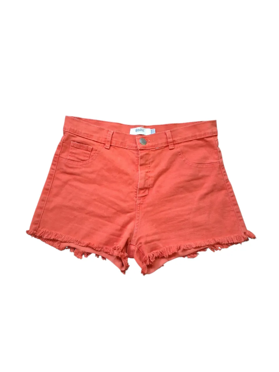 Short de jean tiro alto color naranja con detalles deshilachados en el borde inferior. Marca Sybilla. Talle 38. Medidas: cintura 39 cm, cadera 48 cm, largo 31 cm.