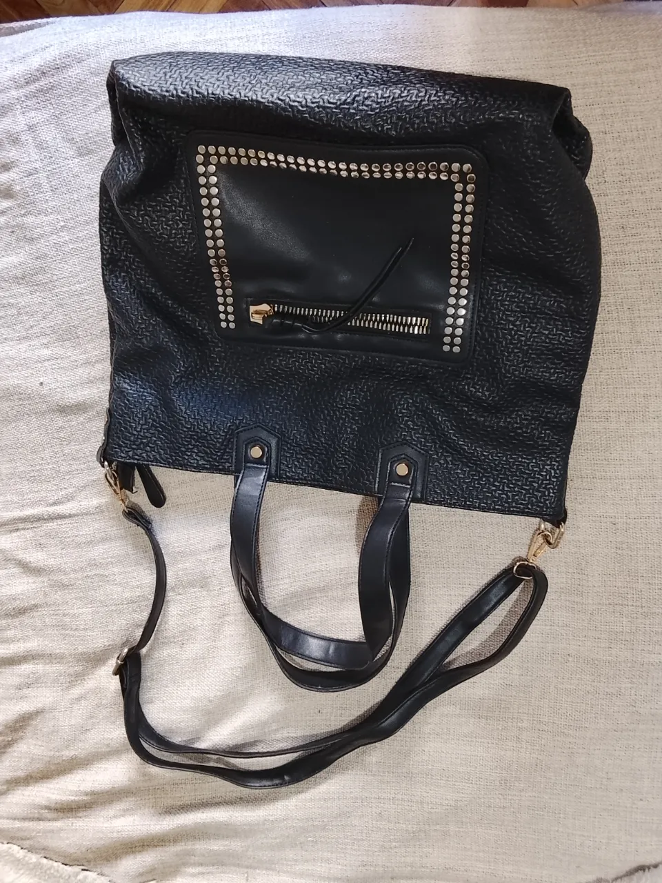 Bolso negro con textura y detalles de tachas plateadas. Posee un bolsillo frontal con cierre y dos asas cortas. Incluye una correa larga desmontable.