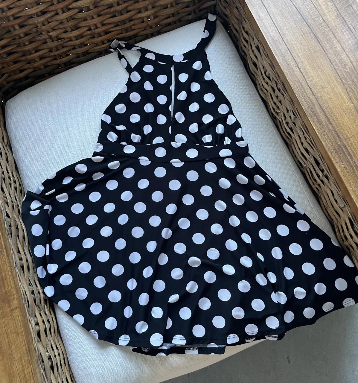 Vestido negro con lunares blancos, ideal para un look retro y divertido. Posee un corte halter con un detalle de lazo en el escote y falda con movimiento. Perfecto para eventos informales o para sentirte canchera en cualquier ocasión.