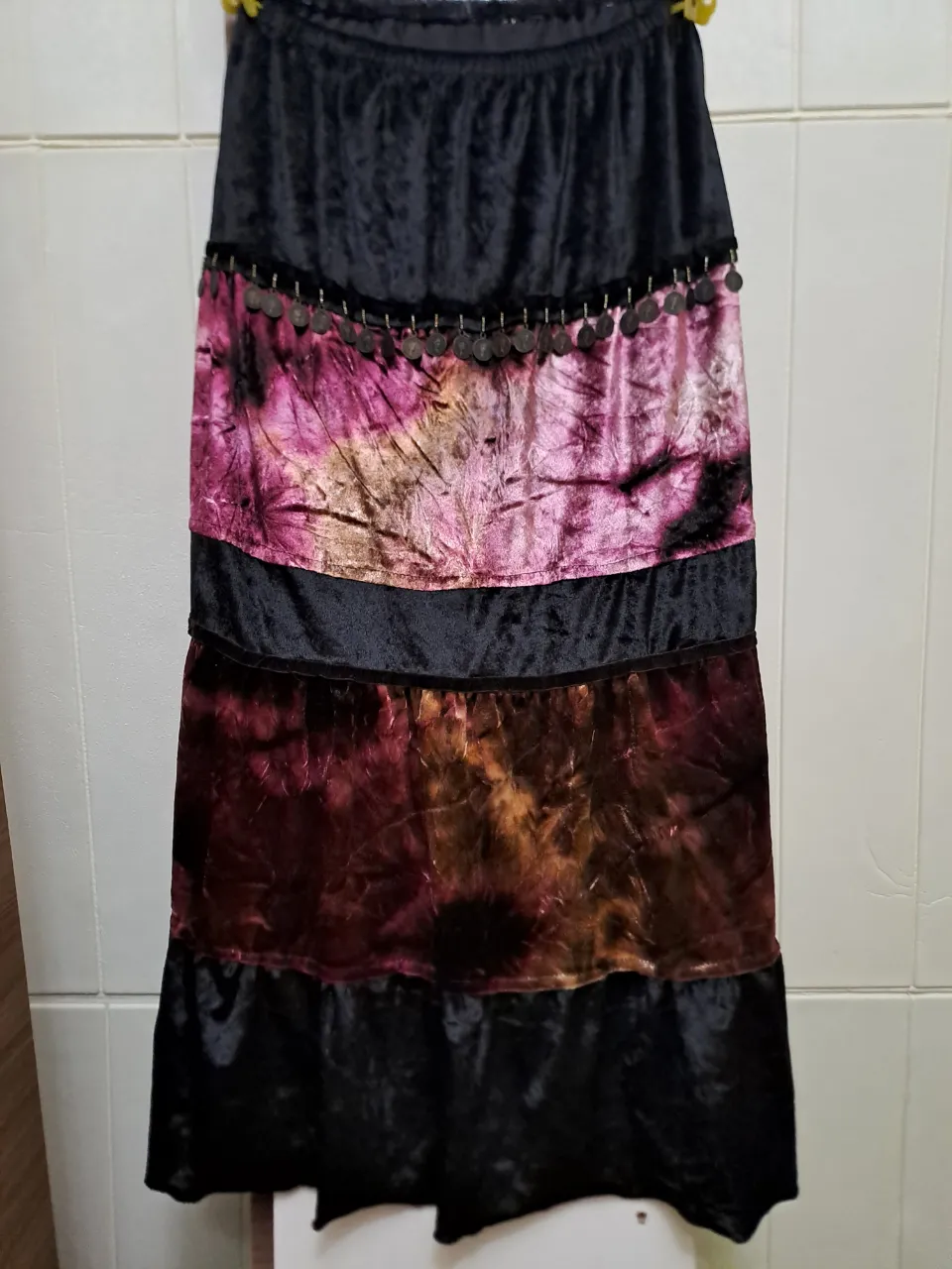 Pollera larga de terciopelo con detalles de monedas y tela estampada en degradé de rosa, marrón y dorado. Posee elástico en la cintura.