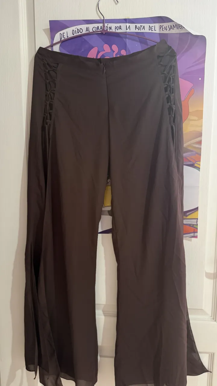 Pantalón palazzo de seda marrón oscuro, con detalles de tiras cruzadas en los laterales de la cintura y aberturas amplias en el bajo. Ideal para un look elegante y bohemio.
