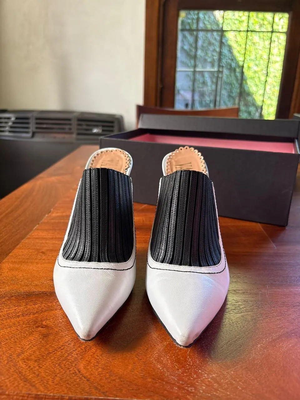 Mules blancos con taco aguja y puntera fina. Tienen una tira de flecos negros en el empeine.