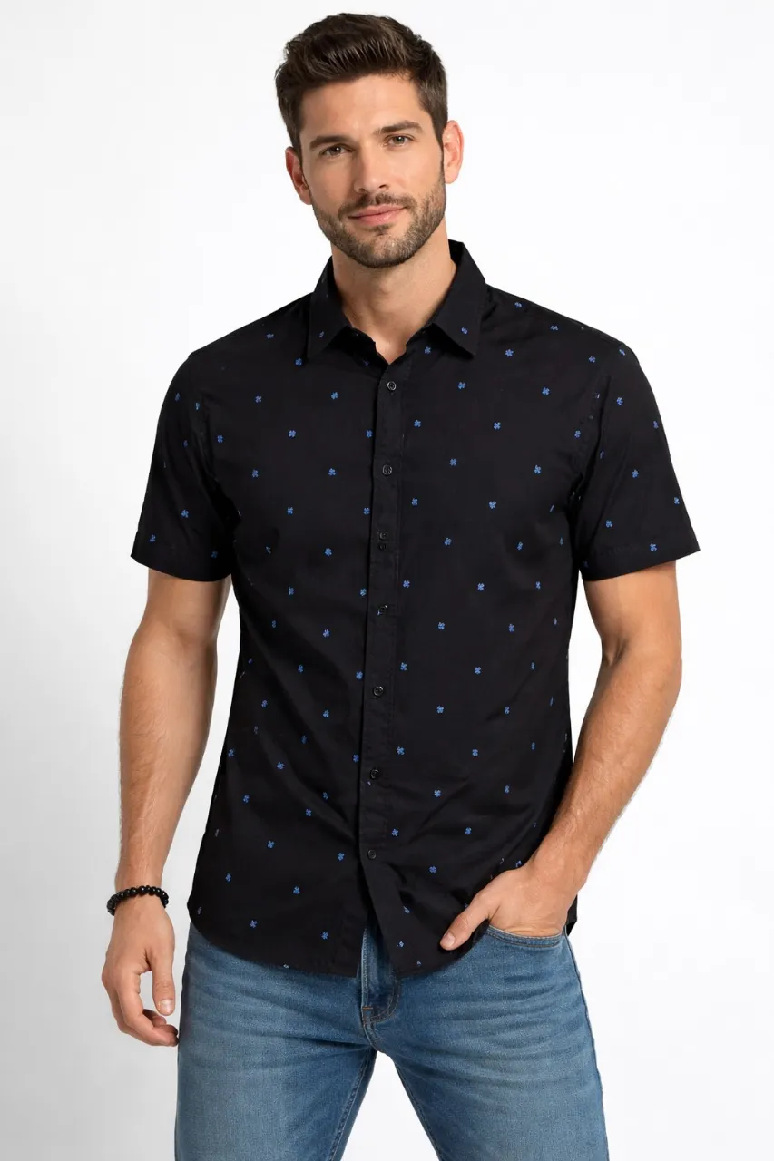 Camisa negra de manga corta con estampa de pequeños motivos florales en color azul. Cuello clásico y botones al frente.