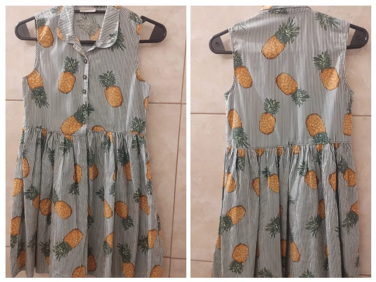 Vestido sin mangas con estampado de piñas sobre fondo a rayas. Tiene cuello tipo camisa y botones en la parte delantera. La falda es amplia y con vuelo. #LCWaikiki #LCWKids #LCWaikikiKids #ModaInfantil #KidsFashion #RopaDeNiña #VestidoDePiñas #PineappleDress #RayasAzules #Verano2026 #OutfitDeNiña #TendenciaKids #StyleKids #GirlFashion #VestidoCamisero
