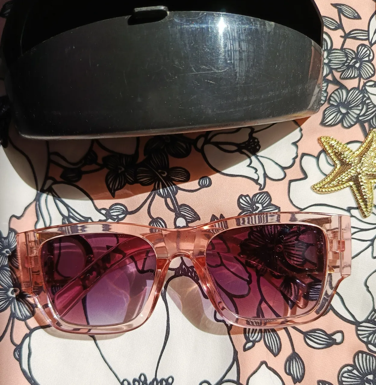 Anteojos de sol rosas con lentes degradé en tonos violetas. La montura es gruesa y transparente. Incluyen estuche negro.
