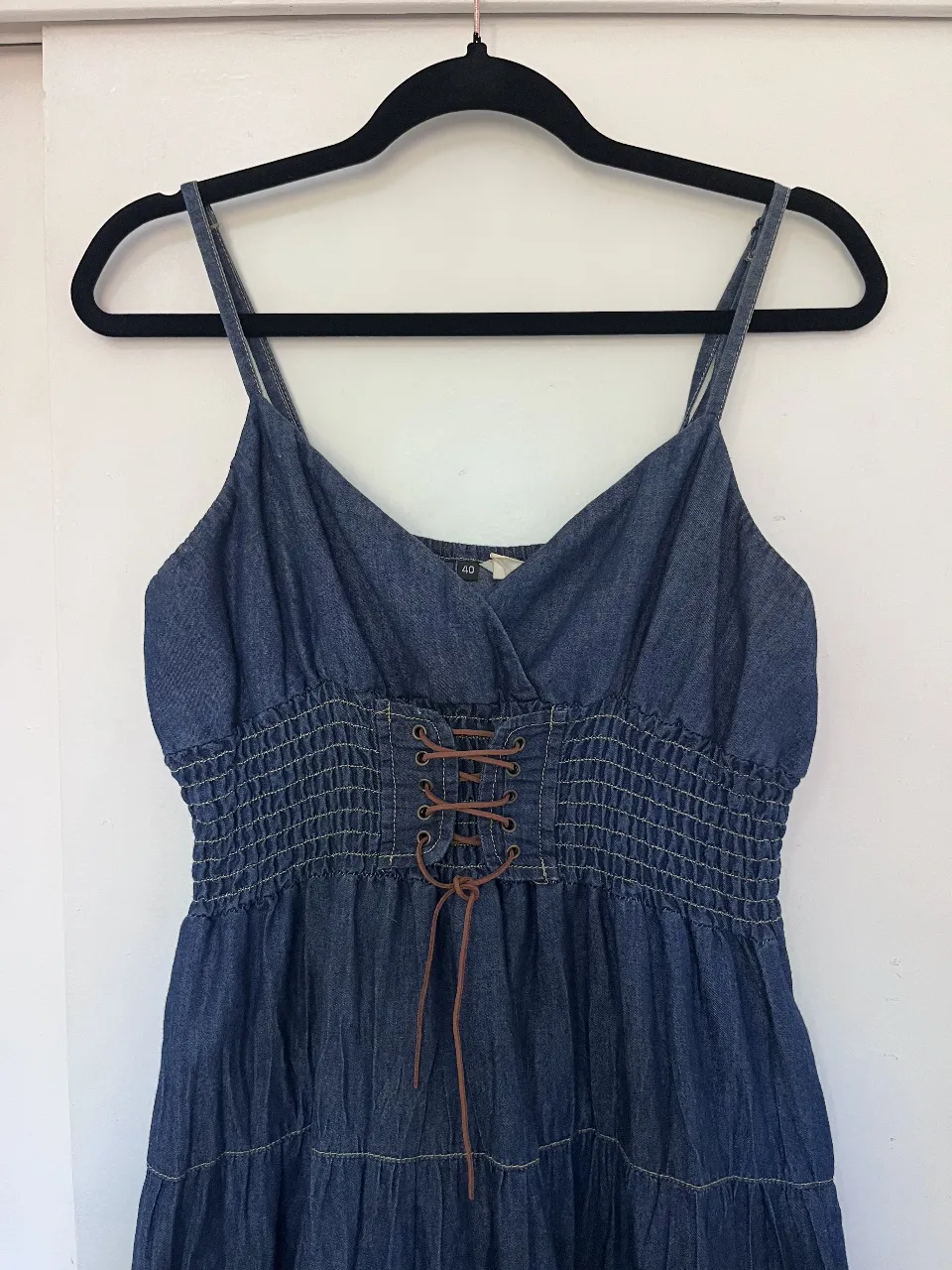 Vestido de jean azul, estilo camisero con tiras finas y detalles de cordones en la cintura. Posee un diseño con frunces y volados en la falda, ideal para un look casual y fresco.