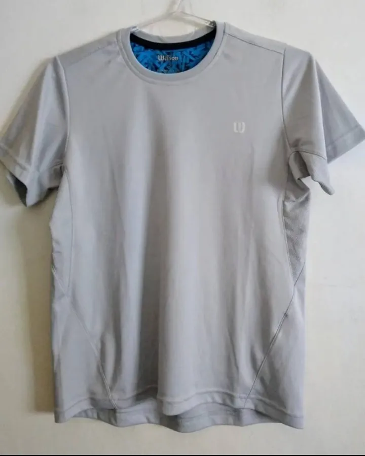 Remera WILSON deportiva gris de manga corta, ideal para entrenamientos o uso casual. Básicamente es de tennis aunque puede ser para otros deportes. Presenta un diseño moderno con detalles en los laterales y un estampado vibrante en el cuello. Talle 3 de niño o talle pequeño p adulto.