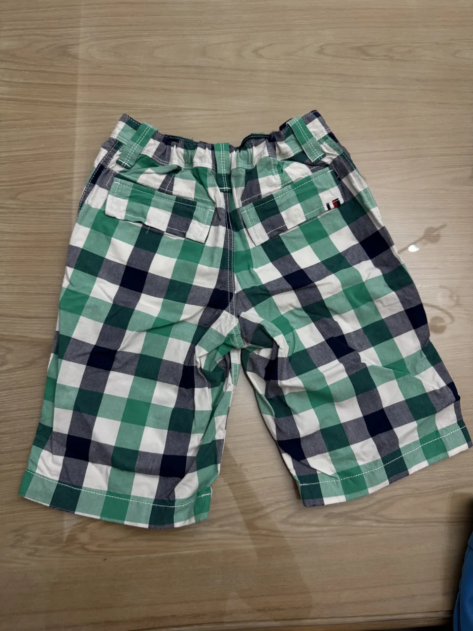 Shorts a cuadros en verde, blanco y azul marino. Tienen bolsillos y cintura elastizada con cordón.