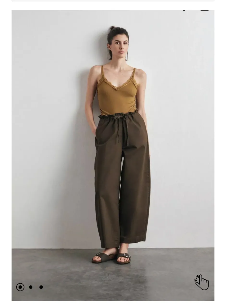 NUEVOS! Elástico y cordón en la cintura, junto con bolsillos laterales y un bolsillo trasero, corte barrel, holgados. Verde oscuro. Última imagen, descripción del pantalón por la marca.