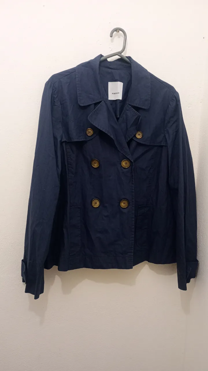 Campera azul marino de Portsaid, estilo trench corto. Tiene doble abotonadura y detalles de costura. Ideal para un look casual o de entretiempo.