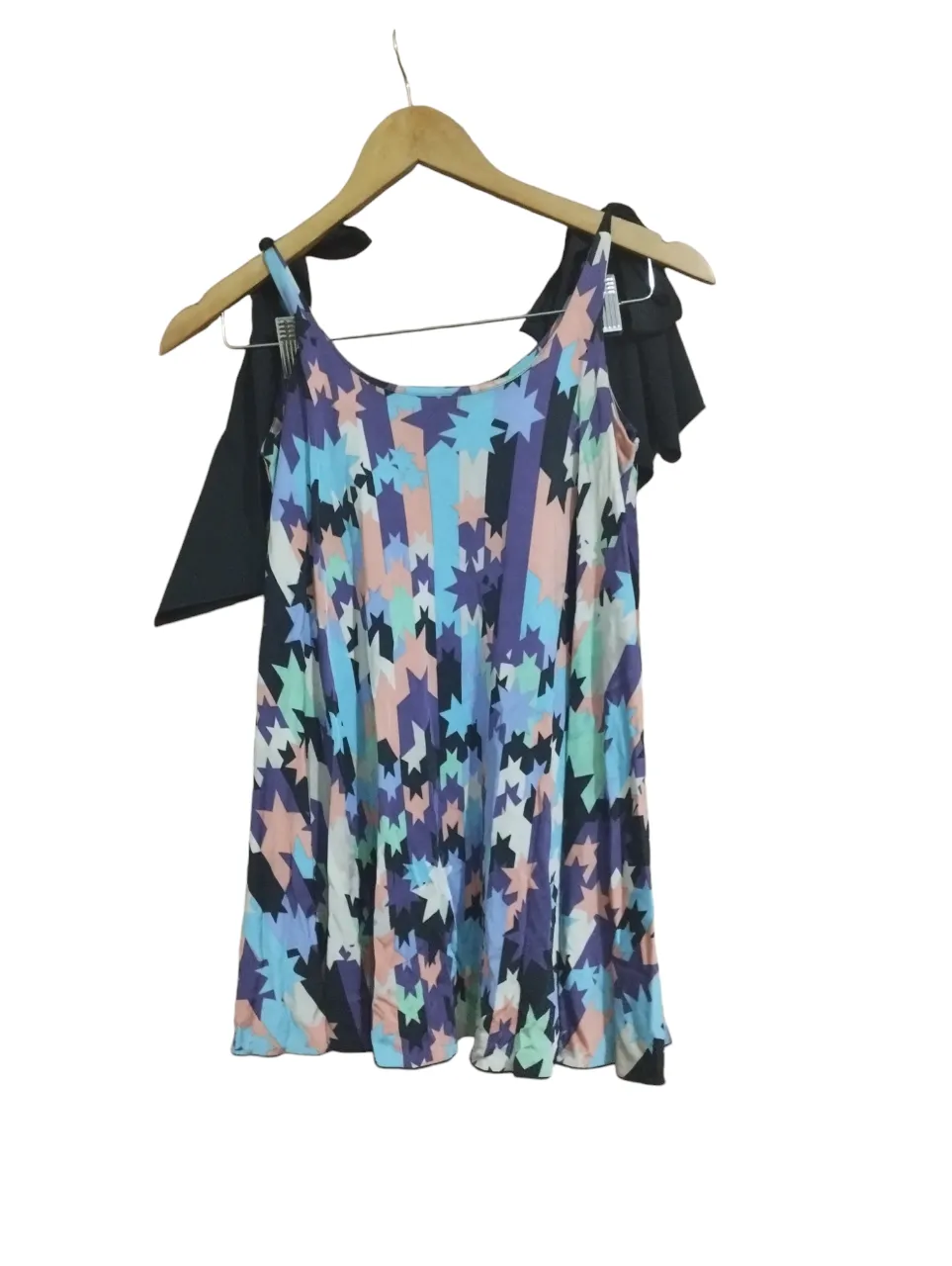 Musculosa estampada con estrellas de colores y lazos negros en los hombros.