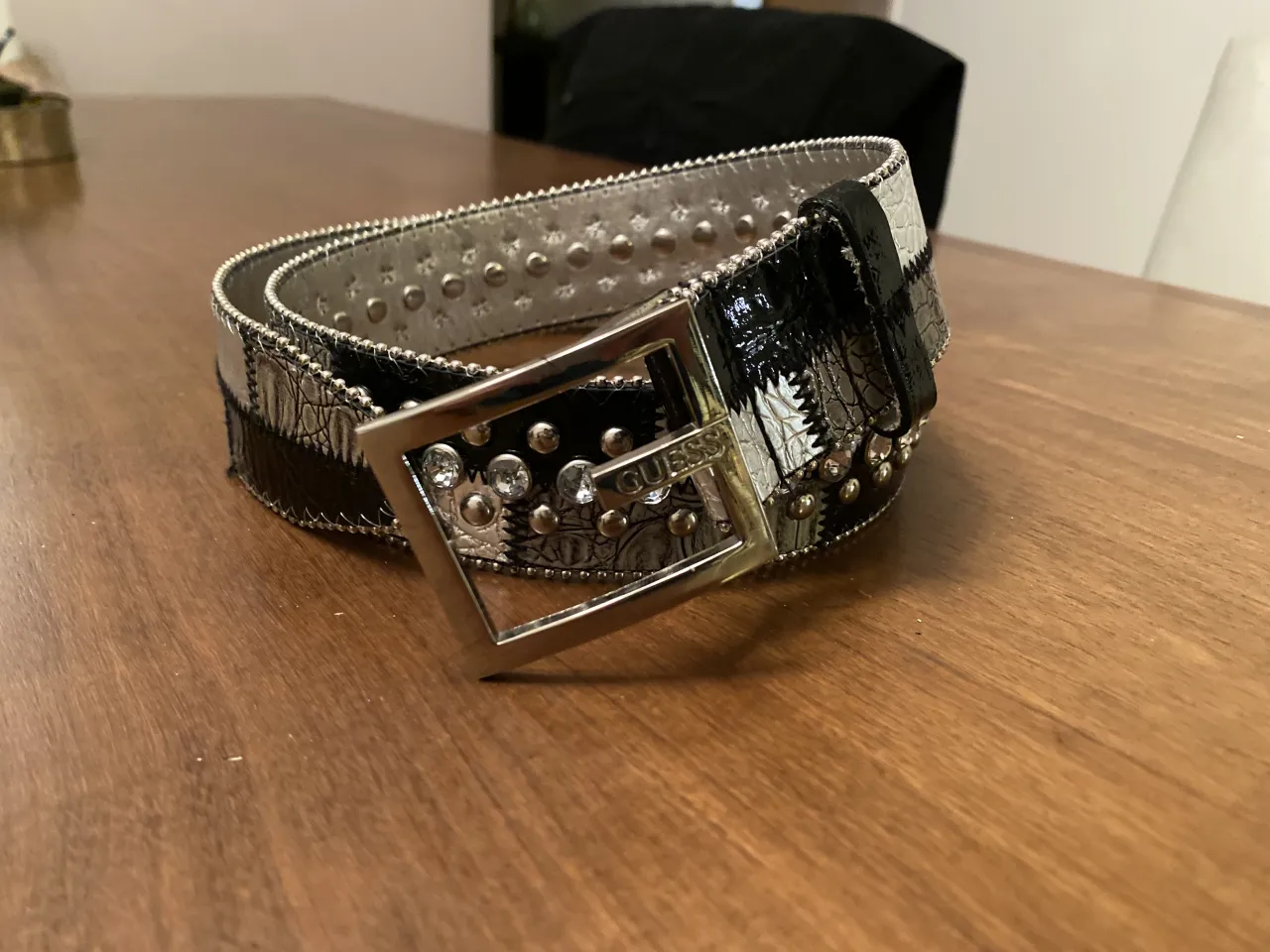Cinturón plateado y negro con tachas y piedras. Hebilla cuadrada plateada con logo.
