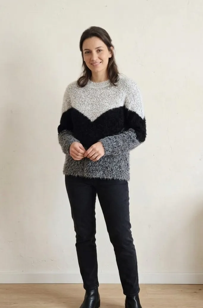 Sweater pelo de mono de tejido suave con diseño de rombos en diferentes tonos de gris y negro. Manga larga y cuello redondo.