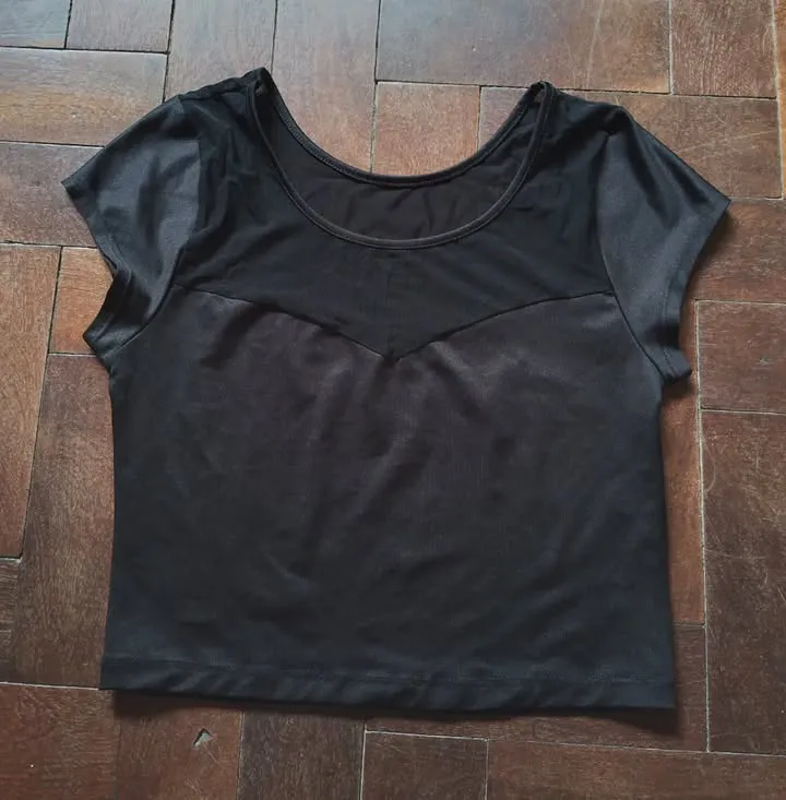 Top negro de manga corta, con detalles de transparencia en la parte superior y espalda. Diseño moderno y versátil, ideal para combinar con diferentes outfits. Talle S. Medidas: axila a axila 37 cm, hombro a hombro 30 cm, largo 40 cm. Es elastizado. ... Comprando dos o más prendas, agrego otra prenda o accesorio de regalo!